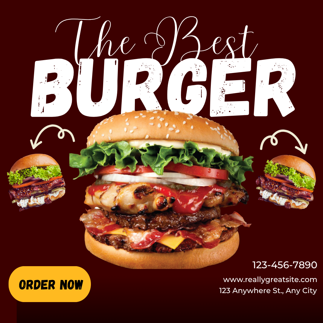 A truly delicious burger is a symphony of textures and flavors, starting with a juicy, seared beef patty topped with melted cheddar, crisp lettuce, and fresh tomatoes. Nestled between a perfectly toasted, soft bun, it offers a savory bite that is both comforting and satisfying. Every mouthful combines savory, rich, and tangy notes, making it a perfect meal.